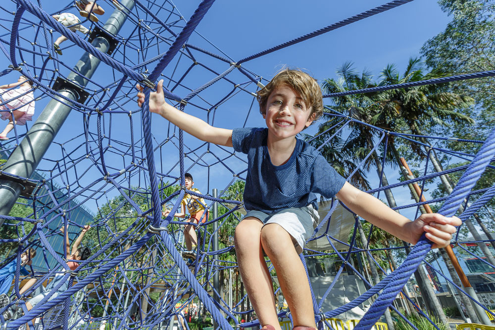 Darling Quarter is a mini-precinct in Darling Harbour, located between Sydney’s famous waterfront and the CBD. At its heart, it features community green spaces, lush native plantings, and the largest (and most kids say ‘best’) playground in Sydney CBD. The Darling Quarter playground is designed to get kids swinging, climbing, balancing, and exploring simple machines and waterworks.