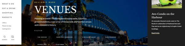 The Rocks website recently relaunched with a brand-new look courtesy of leading Sydney creative agency whiteGREY. Now, visitors can discover even more in-depth information about The Rocks’ Venues, and all they can offer for corporate and brand events and activations. The new website showcases the unique venues available for hire. Among them, Hickson Road Reserve, a grassy open space gorgeously set against the backdrop of Dawes Point and the Sydney Harbour Bridge and Druitt Landing at Darling Harbour’s Cockle Bay, which is a hugely popular place for activations, thanks to its high foot traffic and waterside location.