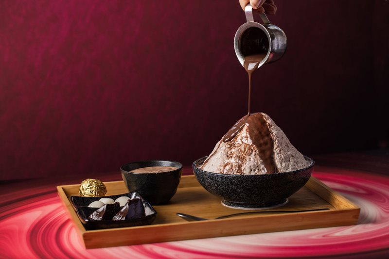 Indulge in a luscious Jersey milk chocolate kakigori topped with velvety chocolate cream, a decadent chocolate fondant, playful dango, and drizzled with rich chocolate sauce.