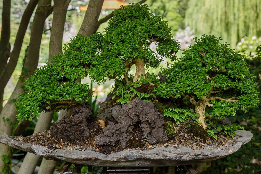 在盆中栽种小树配以石头通常被称为日本盆栽。盆栽起源于中国。中国盆景与日本盆栽风格有所不同,通常体积较大,布局不对称,顶部舒展。枝叶的修剪不拘一格,营造植物自然生长的姿态,效法自然。此处展示的一部分盆景为广东省赠送。